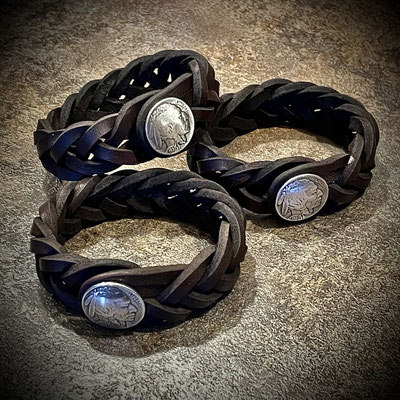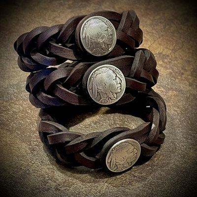 Five-String-Leder-Flechtarmband in schwarz / braun,mit Half-Dollar-Münzconcho-Druckverschluß.